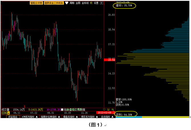 如图1所示,个股右侧筹码分布图在正常情况下是分为上方的蓝色区与下方的黄色区,蓝色区表示的是被套筹码,黄色区表示的是获利筹码,在筹码分布图的左上角与左下角,分别显示了该股被套筹码与获利筹码的详细百分比数值。比如图1中的这只个股,被套筹码为35.70%,获利筹码为64.30%,两者之和为100%,即该股的全部筹码。