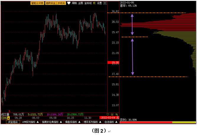 但有的时候,我们也会发现,筹码分布图并不是蓝色与黄色的组合,可能会出现上方为红色下方为黄色,也可能会出现上方为蓝色下方为紫色。那么这种颜色的变化又有什么含义?代表了怎样的信息呢?首先我们来看一下图2:
