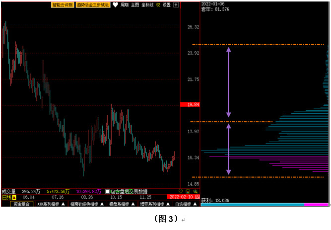 如图3所示,该股右侧筹码分布图上方的蓝色区域没有变化,但下方的黄色区域变为了紫色区,这表明该股的筹码出现了低位密集状态。与高位密集状态相似,低位密集状态指的是筹码分布图所包含的整个价格区域内,在最下面的30%的价格区间内,聚集了62%以上的筹码。由于大多数筹码都集中到了低位,这时如果股价出现上涨,下方的支撑力度就会很强大,对后期股价的向上运行产生支撑作用,所以每当出现筹码低位密集的时候,筹码分布图中下方的黄色区就会变成紫色,以便提醒大家注意低位的投资机会。