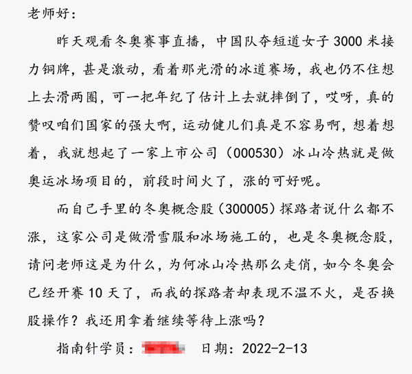 这位朋友你好!研究所老师已经认真阅读了你的来信,信中所提到的冬奥概念股属于消息刺激的题材类热点,消息方面,北京冬奥会在开赛短短几天便成为了历史上收视率最高的一届冬奥会,超过平昌冬奥会整个赛事期间的总和,另外北京冬奥会在日本、美国、加拿大、韩国的收视率都非常高,社交媒体上已经超过20亿人次关注,冬奥会概念股涉及体育、地产、旅游等行业,可以说影响力是比较大的,在A股市场上,相关上市公司也迎来了机会。这位朋友信中提到的冰山冷热和探路者都属于名副其实的冬奥概念股,可是为什么冰山冷热那么走俏,而探路者却始终没有表现呢?