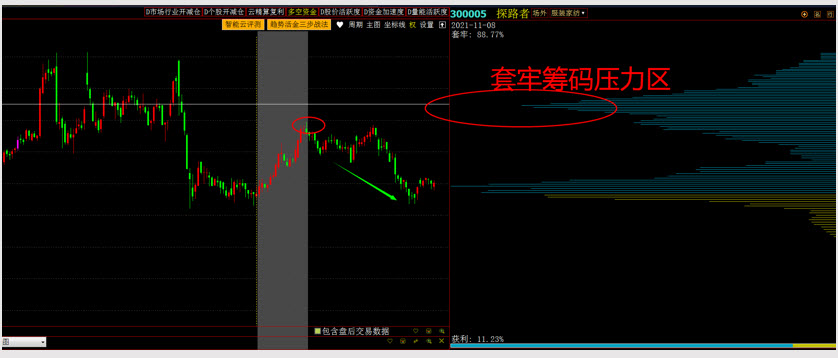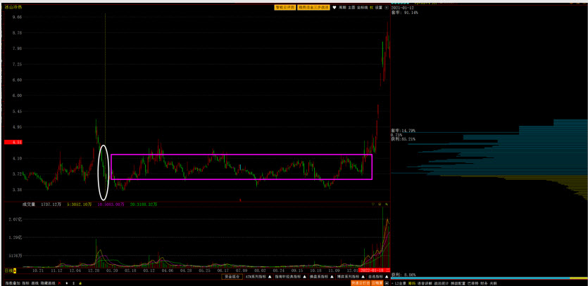 如图所示,冰山冷热在拉升之前其实已经做了长达1年之久的横盘震荡,俗话说横有多长,竖有多高,可见这个股票在拉升之间就做了充足的准备,此前有过一波拉升,如果我们把指针锁定在前年12月这天(图中白色圆圈),当时股价也处在低位,若在那时操作买进这个股票,估计得等上1年才能等来这波行情,此时我们不妨观察一下右侧筹码,我们看到当时有一大堆蓝色的筹码,这部分属于套牢筹码,主要位于3.6元之上,同时我们注意到,这部分筹码处于发散状态,如果股价从这个位置发动拉升行情,几乎是难上加难,层层叠叠、大大小小的套牢筹码等着解套,所以在接下来的走势中,股价继续表现震荡,一会上去一会下来,形成一个窄幅的震荡区间。