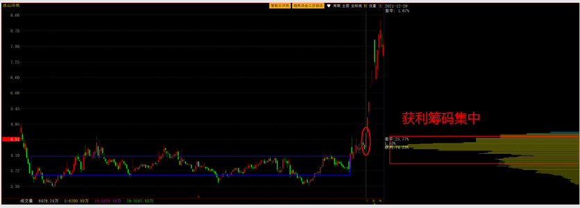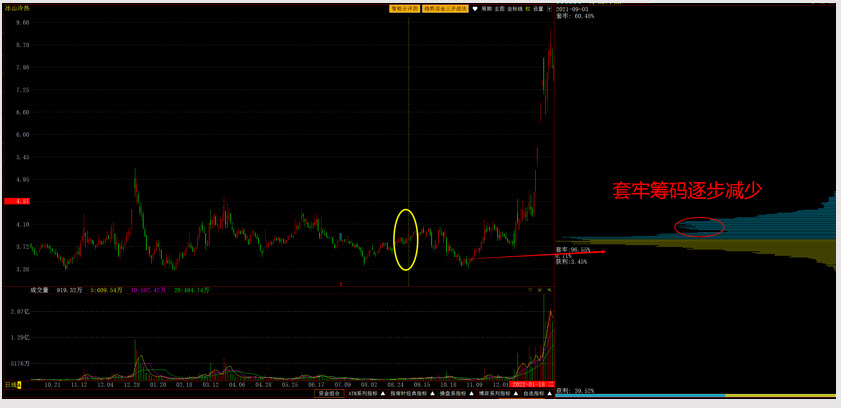 再向后看,筹码又发生了新的变化,上方的套牢筹码变的越来越少了,下方低位筹码变的原来越集中了,在这个过程中,上方被套牢的筹码再次向下转移,主力在底部完成充分的吸筹。而且这时低位高度集中,从这个股票上可以看出,明显看到筹码的一个乾坤大挪移的互换过程,最终主力经过200多个交易日的辛苦收集,完成低位吸筹,主力充分完成吸筹之后,该股借着冬奥消息东风之力,迎来一波行情。