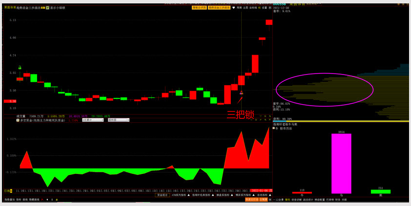 从消息层面来说,冬奥消息刺激该股的走强是一个主导因素,比如像000530冰山冷热这样的品种,该股在年前就已经发动拉升行情,逆势走强,如果遇到这样的品种,及时的根据趋势拐点信号或资金跟进操作,往往能够取得较好的利润。那这个股票为什么会提前走强呢?这其中是不是早有主力提前布局呢?大家知道,在股市中主力拥有资金优势、消息优势,主力看散户的牌非常容易,而散户想知道主力的底细却比较困难,我们平时通过个股k线、成交量基本上很难判断主力的意图,但是主力由于资金体量比较大,所以一定逃不过筹码的火眼金睛。