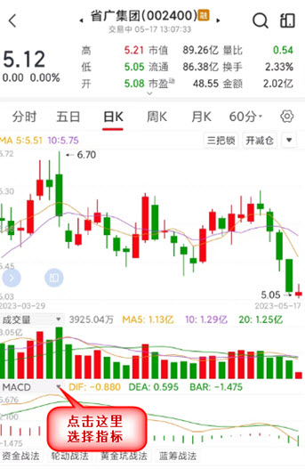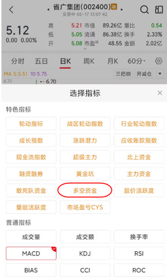 如图所示,我们手机中打开某只股票的日K线图之后,成交量下方的指标框中有可能并不是资金指标,而是其它指标,比如图中的MACD。这时大家如果想看资金的话,就需要选择资金指标。
