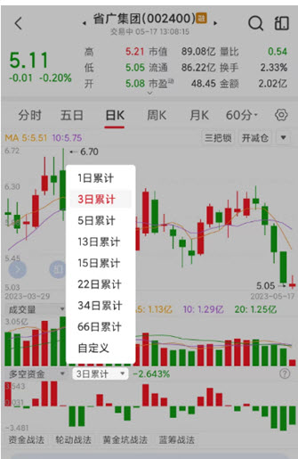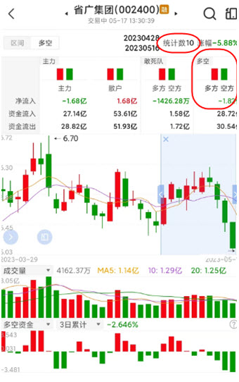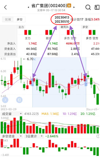 如图所示,蓝色的透明区间的左侧与右侧各有一个箭头,我们用手指点中该箭头并滑动手指,即可改变区间统计起始时间与终止时间的位置。比如在上图中,我们通过滑动蓝色透明区间的左右箭头,将多空区间统计时间段调整为从2023年4月13日到2023年5月10日,共17个交易日。可以看到,该股在这17个交易日中,多空资金为流入状态,净流入的数额为2.21亿。