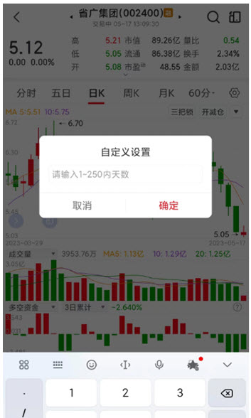 如图所示,在资金周期自定义设置界面中,我们可以按照自己的需要设置资金统计周期的天数。但需要注意的是,手机版软件支持的最大资金统计周期天数为250天,如果超过这个范围系统会给出重新输入的提示信息。