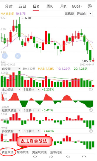 当然,还有一些朋友可能想同时观察主力资金、敢死队资金、以及多空资金的进出情况,如果您也有这样的需要,只需点击指标框下方的“资金战法”,软件就会立即将主力资金、敢死队资金、以及多空资金三个资金指标都显示在K线图的下方,见图: