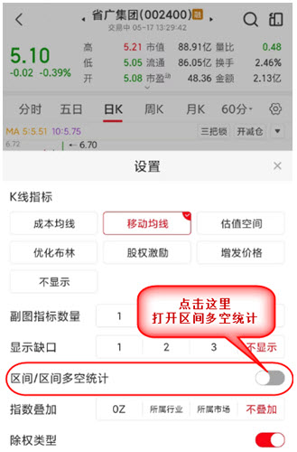 如图所示,先点击手机版K线图右上角的齿轮图标,就可以打开设置窗口。在设置窗口当中,有一个“区间/区间多空统计”的选项,在默认情况下,该选项是处于关闭状态。我们点击其后面的开关按钮,即可打开区间多空统计功能。