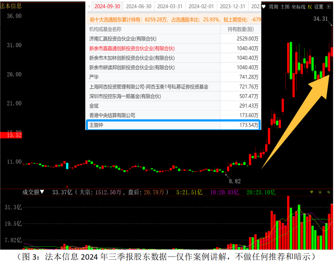 通过图3能够看到:王暨钟去年三季度进场法本信息,位列第十大流通股东,持股173.54万股,股价从8块多一路上涨至30以上,王暨钟大赚!