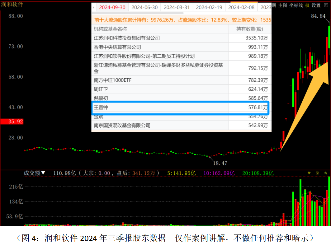 通过图4能够看到:王暨钟去年三季度进场润和软件,位列第八大流通股东,持股576.81万股,股价从20块多一路上涨至80以上,王暨钟4倍牛股抓到手!