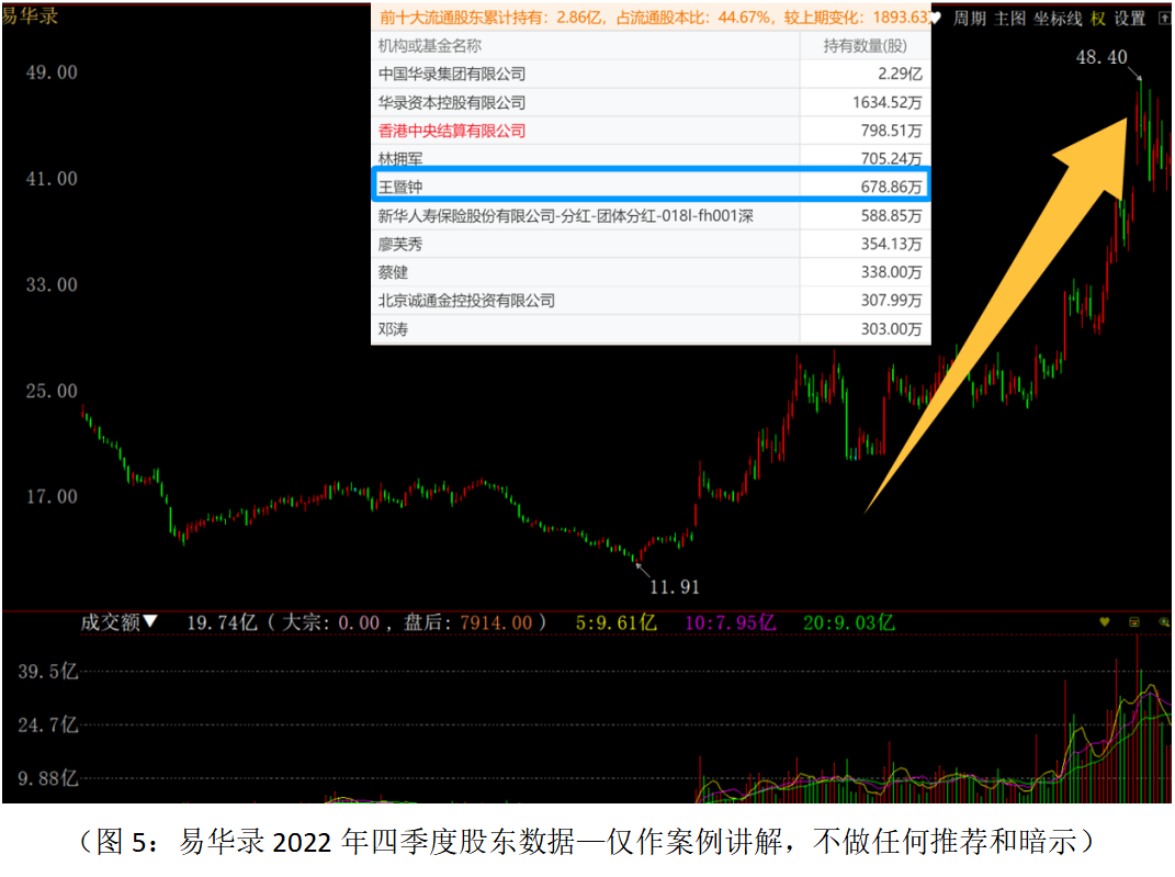 通过图5能够看到:王暨钟2022年四季度进场易华录,位列第五大流通股东,持股678.86万股,股价从12块左右一路上涨至48以上,又是一只4倍牛股!
