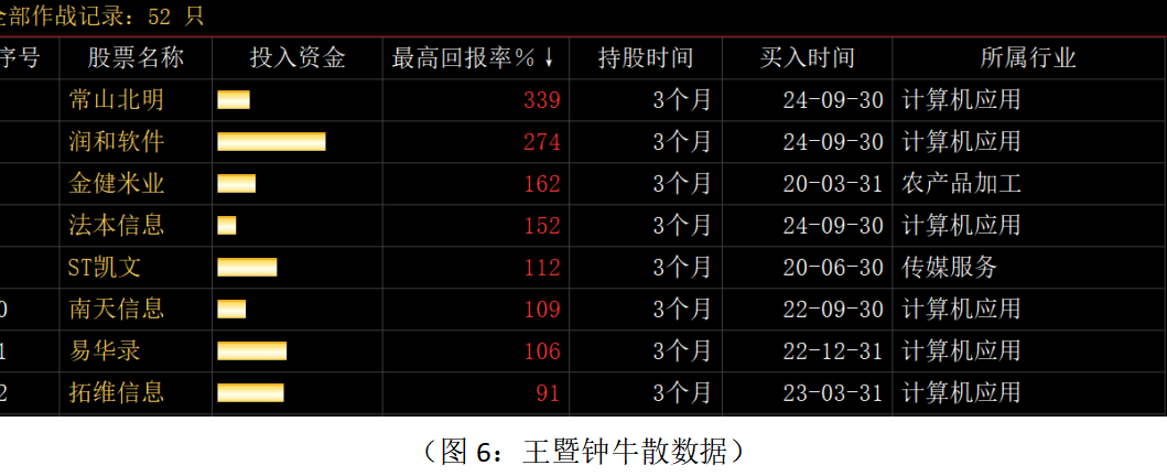 第三点,操作风格,主要以计算机、传媒服务、专用设备、元件、电子半导体等科技成长股为主。在当前经济转型的新一轮牛市行情中,人工智能、机器人、高端装备等新质生产力方向一定是重要主线,其中也会诞生一批龙头股。这样一位擅长捕捉科技成长牛股的牛散,大家可要重点跟踪!如图6: